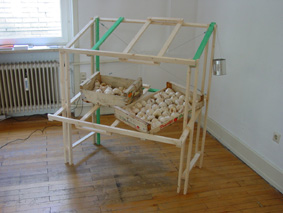 | Der Titel und die Idee zu der Ausstellung "We're not here to give you pleasure" stammt von Charles Jeffery. Frankfurt am Main ist die erste Station von insgesamt drei Ausstellungen, die im Anschluss in Rennes in Frankreich und Cardiff in Wales stattfinden. Während die eingeladenen Künstlerinnen und Künstler jeweils in derselben Konstellation bleiben, ändern sich die ausgestellten Arbeiten entsprechend der unterschiedlichen Ausstellungsorte und Titel (Rennes: "We're not here to give"; Cardiff: "We're not here"). Die Auswahl der teilnehmenden Künstlerinnen und Künstler beruht nicht so sehr auf Charles Jefferys kennendem Blick - er ist vielmehr Künstler als Kurator - sondern vielmehr auf Vertrauen in die Arbeit der einzelnen TeilnehmerInnen und auf der Neugierde, Kunst unterschiedlicher Inhalte von Künstlerinnen und Künstlern verschiedener Nationalitäten zueinander in Beziehung zu setzen. Christopher Brown (geb. 1971 in Cardiff, Wales) zeigt eine Installation, die visuelle und audielle Wahrnehmungsformen zueinander in Beziehung setzt. Ein dunkelblauer Satinvorhang hängt vor einer Wand und verdeckt zum Teil eine Tür. Er ist so von der Sonne ausgeblichen, dass er große hellbraune Flächen aufweist. Konfrontiert mit elektrisch erzeugten Geräuschen eines Gewittersturmes sind in dieser Arbeit natürliche Gewalt und künstliche Prozesse - der Vorhang weist Bilder auf, die gleich Fotografien durch helles Licht entstanden sind - auf wechselwirkende Weise miteinander konfrontiert. Die Fotografie von Thomas Dale (geb. 1974 in Candle) trägt den Titel "Civilian Twilight" (Bürgerliche Dämmerung) und konfrontiert urbanen Raum und künstliches Licht. Im grauen Himmel eines Stadtraumes, der Siedlungen aus Backstein, die auf sozial arme Bewohner schließen lassen mit dahinterliegenden Wohnblocks aus grauem Beton mit Balkonen konfrontiert, erscheint ein Licht. Es ist jedoch kein natürliches Sonnenlicht, es ist die Spiegelung einer leuchtenden Glühbirne in einem Innenraum, dessen Fenster den beschriebenen Ausblick bietet, platziert im natürlichem Raum zwischen sozial differierenden Zeichen bürgerlicher Gesellschaftsschichten. Sofia Hulten (geb. 1972 in Stockholm) zeigt Fotos vorgefundener Situationen in Berlin. Die gewählten Ausschnitte lenken den Blick auf Interventionen - Zeichen menschlicher Eingriffe in die Straßen, die Architektur und das Leben im urbanen Wohnraum. Sie fokussieren Straßenmalereien oder Grafittis und lenken den Blick damit auf beiläufige Bilder, die häufig vor dem Hintergrund eines technisierten und arbeitsgelenktem Alltag nicht oder nur ungern wahrgenommen werden. Charles Jeffery (geb. 1975 in Oxford) fixiert den Schriftzug "make something" auf die Wand und ruft auf abstrakte Weise zum Prozess auf, zum machen schlechthin. Diesen programmatischen Aufruf konterkariert seine Aktion zur Ausstellung. Charles Jeffrey kocht in Frankfurt Würstchen aus Cardiff, wird in Rennes Frankfurter Würstchen und in Cardiff Würstchen aus Rennes kochen und sie den Besuchern zum Essen anbieten. Damit betont er auf kulinarische und metaphorische Weise einen Prozess national übergreifender Art. Die gemeinsame Arbeit von Peter Lütje (geb. 1968 in Hamburg) und Haegue Yang (geb. 1971 in Seoul, Korea) besitzt ebenfalls Dienstleistungscharakter, wobei jedoch der Besucher die Arbeit kaufen kann. Die gesamte Arbeit ist vierteilig und besteht aus insgesamt vier Knoblauchknollen, die zwei Paare bilden. Das Paar Peter Lütjes ist gestempelt mit dem grünen Wort "Kupfer" und dem roten Wort "Eisen" - die Farbe der Wörter weist jeweils auf den Kern des anderen vor der Oxidation (Kupfer: erst rot, nach Oxidation grün; Eisen: erst grau, nach Oxidation rot). Ein weiteres Paar von Haegue Yang (geb. 1971 in Seoul) ist gestempelt mit den Zeichen für Yin und Yang - die asiatischen Symbole dafür, dass in allem Guten ein Böser und in allem Bösen ein guter Kern steckt. Gemeinsam stellen beide Paare eine Vermittlungsform ähnlicher Inhalte mit national differierenden Konnotationen dar. Anthony Shapland (geb. 1973 in Worcester) projiziert einen in Echtzeit produzierten Videofilm mit dem Titel "Lamp". Auf der Außenwand der Ausstellungsräume, setzt sich deren Inhalt direkt in Beziehung zum Stadtraum Frankfurts. Der Film fokussiert eine Straßenlaterne vor blauem Himmel bei Tageslicht, die Laterne ist zunächst aus. Im Lauf der Zeit verdunkelt sich das natürliche Licht, nach und nach erhellt sich das elektrische Licht der Laterne. Der Film zeigt einen leisen und langsam sich vollziehenden Wechsel zwischen natürlicher und künstlich erzeugter Atmosphäre. "When the light is on, the night comes" (Wenn das Licht angeht, kommt die Nacht) - diese Redewendung umschreibt den Verweis eines artifiziellen Phänomens auf ein natürliches und damit eine Metapher der artifiziell geprägten Wahrnehmungsweise moderner Zeiten. Benoit Travers (geb. 1974 in Rennes) weist auf die Differenz zwischen durch Medien vermittelter idealer Kultur und real existierender Welt. Die mit Plastikfolie beklebte Wand ist nicht glatt und weist bei genauerem Blick dreckige Stellen auf. Dementsprechend zeigt das Foto eines mit Sommersprossen übersäten Körperausschnittes, eher das Gegenbild des gängigen Schönheitsideals. Die Ansichtskarten der Bretagne vermitteln Bilder einer heilen Welt leerer Strände und traumhafter Sonnenuntergänge - jegliche Spuren und Zeichen negativer soziokultureller Erscheinungen werden negiert. Die Differenz zwischen Schein und Sein wird deutlich. Das Video von Gary Ward (geb. 1975 in Monaghan) konfrontiert mit einer nicht alltäglichen Situation. In einer Straße eines Londoner Wohnviertels - Autos parken am Straßenrand, Passanten gehen vorbei, die Schilder eines Waschsalons und eines Imbisses umgeben einen Hauseingang - ist ein Fenster einer Wohnung geöffnet. Zwei Lautsprecher sind in Richtung der Straße gedreht, aus ihnen erfüllt laute Schlagermusik die urbane Alltagsatmosphäre, ab und zu blickt